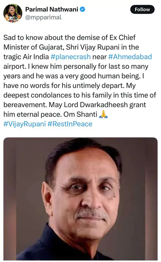 अहमदाबाद में हुए एयर इंडिया विमान हादसे के बाद भाजपा के राज्यसभा सांसद परिमल नाथवानी ने एक ट्वीट कर गुजरात के पूर्व मुख्यमंत्री विजय रूपाणी के निधन की जानकारी दी है। उन्होंने ट्वीट में लिखा कि,