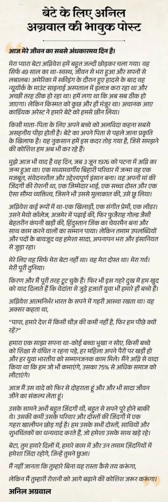 Agnivesh Agarwal death news : अपने पोस्ट में अनिल अग्रवाल ने लिखा कि अग्निवेश न सिर्फ उनके बेटे थे, बल्कि उनके सबसे अच्छे दोस्त, मार्गदर्शक और प्रेरणा भी थे। उन्होंने बताया कि बेटे से किए गए वादे को निभाते हुए वे अपनी कुल कमाई का 75% हिस्सा समाज सेवा और जनकल्याण के कार्यों में दान करेंगे। यह निर्णय उन्होंने बेटे की सोच और मूल्यों से प्रेरित होकर लिया है।