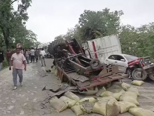 Salumbar Police : शाम करीब 5 बजे मायदा घाट की खतरनाक ढलान पर यह हादसा हुआ। जानकारी के मुताबिक, एक ट्रैक्टर-ट्रॉली, जो सीमेंट से भरी थी, पलट गई थी। इसे सीधा करने के लिए एक जेसीबी मशीन मौके पर आई, जिसके चलते बांसी-धरियावद मार्ग पर वाहनों की लंबी कतार लग गई। इसी बीच, पीछे से तेज रफ्तार में आ रहा लोहे से लदा ट्रक बेकाबू हो गया। ट्रक ने कार, बाइक और ट्रैक्टर सहित 5 वाहनों को एक के बाद एक जोरदार टक्कर मारी।