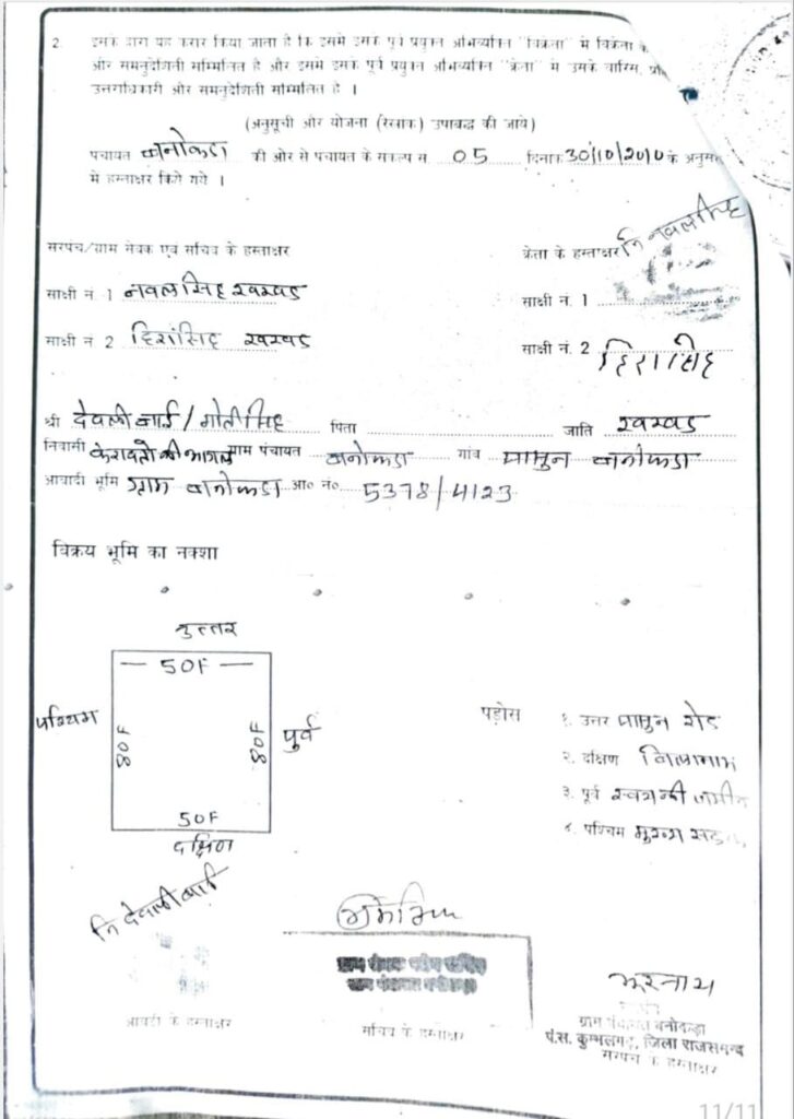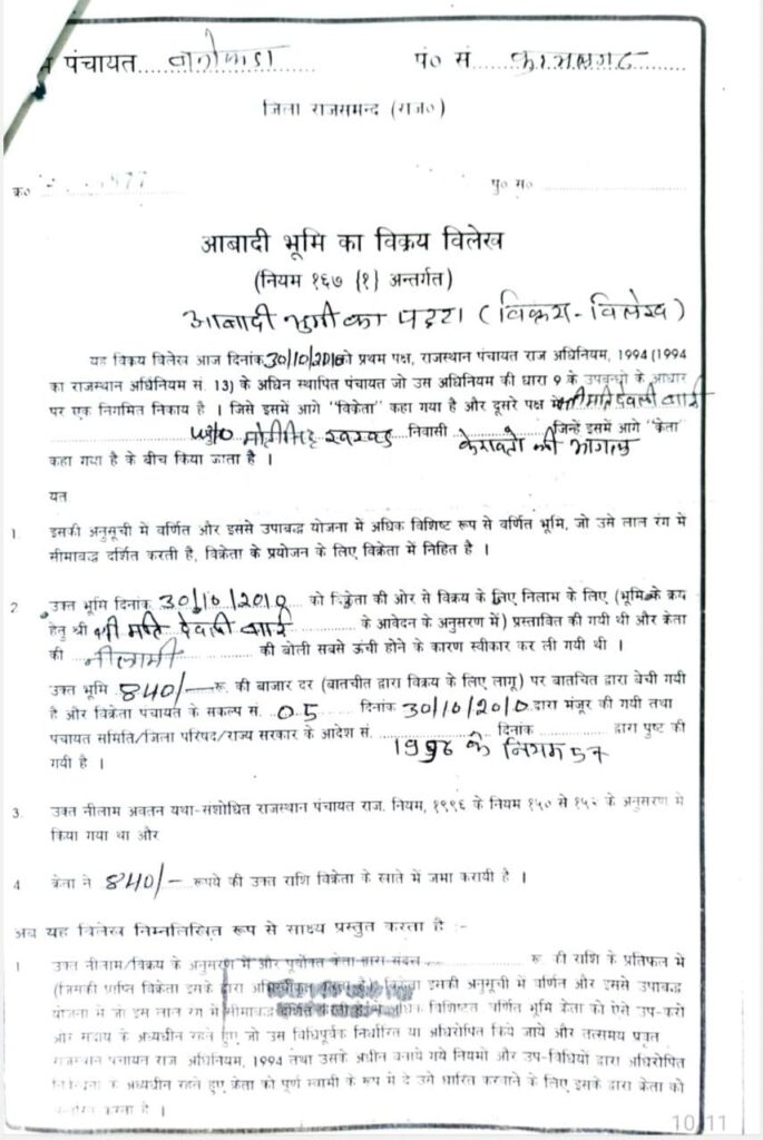लक्ष्मण सिंह राठौड़ @ राजसमंद : Fake land patta : गांव में मृत महिला के नाम सरकारी जमीन का फर्जी पट्टा बनाकर व्यवसायिक मार्केट का निर्माण किया जा रहा है। क्षेत्रीय लोगों की शिकायत पर पंचायतीराज विभाग द्वारा पुराना रिकॉर्ड खंगालने व प्रारंभिक जांच करने पर मृत महिला के नाम फर्जी पट्टा बना सरकारी जमीन रफादफा करने का खुलासा हुआ। महिला की मौत के पांच साल बाद पट्टा बनाया। फिर भी दबंगई के दम पर दुकानों का निर्माण जारी है, जिससे ग्राम पंचायत बनोकड़ा के प्रशासक व ग्राम विकास अधिकारी की कार्यशैली भी सवालों के घेरे में आ गई है।