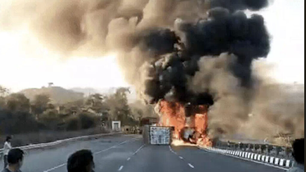 Highway Accident in udaipur : उदयपुर-अहमदाबाद नेशनल हाईवे पर शनिवार शाम एक भीषण सड़क हादसे ने कुछ ही पलों में अफरा-तफरी मचा दी। तेज रफ्तार टैंकर अचानक बेकाबू होकर डिवाइडर तोड़ता हुआ दूसरी लेन में जा घुसा, जहां सामने से आ रहे कंटेनर से टकरा गया। दुर्घटना इतनी जबरदस्त थी कि दोनों वाहनों में पलभर में आग लग गई और हाईवे आग की लपटों व धुएं के गुबार से ढक गया। हादसे के बाद हाईवे पर चल रहे वाहन जहां के तहां थम गए। लोग अपनी जान बचाने के लिए गाड़ियों से उतरकर दूर भागते नजर आए। आग इतनी विकराल थी कि कुछ देर के लिए पूरा इलाका दहशत में आ गया। हादसे में दोनों वाहनों के ड्राइवर गंभीर रूप से घायल हो गए, जिन्हें स्थानीय ग्रामीणों की मदद से तुरंत अस्पताल पहुंचाया गया। घटना की सूचना मिलते ही पुलिस और दमकल विभाग मौके पर पहुंचा और कड़ी मशक्कत के बाद आग पर काबू पाया गया। इस हादसे के कारण हाईवे के दोनों ओर लंबा जाम लग गया, जिससे यात्रियों को भारी परेशानी का सामना करना पड़ा।