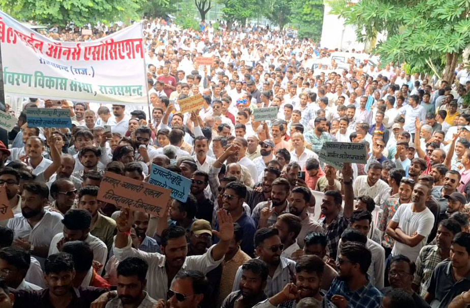 Marble royalty hike Rajasthan : मार्बल माइंस मालिक के साथ गैंगसा, कटर कारोबारी के साथ खाद्यान्न, होटल व्यापारी, श्रमिक केलवा में एकत्रित हुए, जहां एक सभा हुई। उसके बाद वाहन रैली केलवा से रवाना हुई, जो फोरलेन पर मोखमपुरा, पसूंद, मोरचणा, सेवाली, राजनगर, कलालवाटी होकर किशोरनगर मंडा से पुरानी कलक्ट्री परिसर में एकत्रित हुए। यहां अल्पाहार के साथ सभी लोग पैदल मार्च करते हुए जिला कलक्ट्री पहुंचे, जहां सरकार के खिलाफ जमकर नारेबाजी की। बाद में एक प्रतिनिधि मंडल ने मुख्यमंत्री के नाम अतिरिक्त जिला कलक्टर नरेश बुनकर को ज्ञापन सौंपा। साथ ही चेतावनी दी कि अगर दो दिन की समयाविध में सरकार उचित निर्णय नहीं लेती है तो उग्र आंदोलन किया जाएगा। इस दौरान मार्बल माइंस ऑनर्स एसोसिएशन अध्यक्ष गौरवसिंह राठौड़, तनसुख बोहरा, ट्रेडर्स एसोसिएशन अध्यक्ष गोविंद सनाढ्य, दिनेश बड़ाला, महेंद्र कोठारी, लक्ष्मण गुर्जर, हरिसिंह राठौड़, नानालाल सिंधल, रामनारायण पालीवाल, सत्यप्रकाश काबरा सहित हजारों की संख्या में कारोबारी, श्रमिक व बाजार के व्यापारी मौजूद थे।