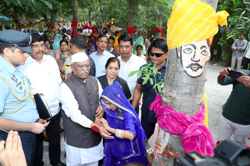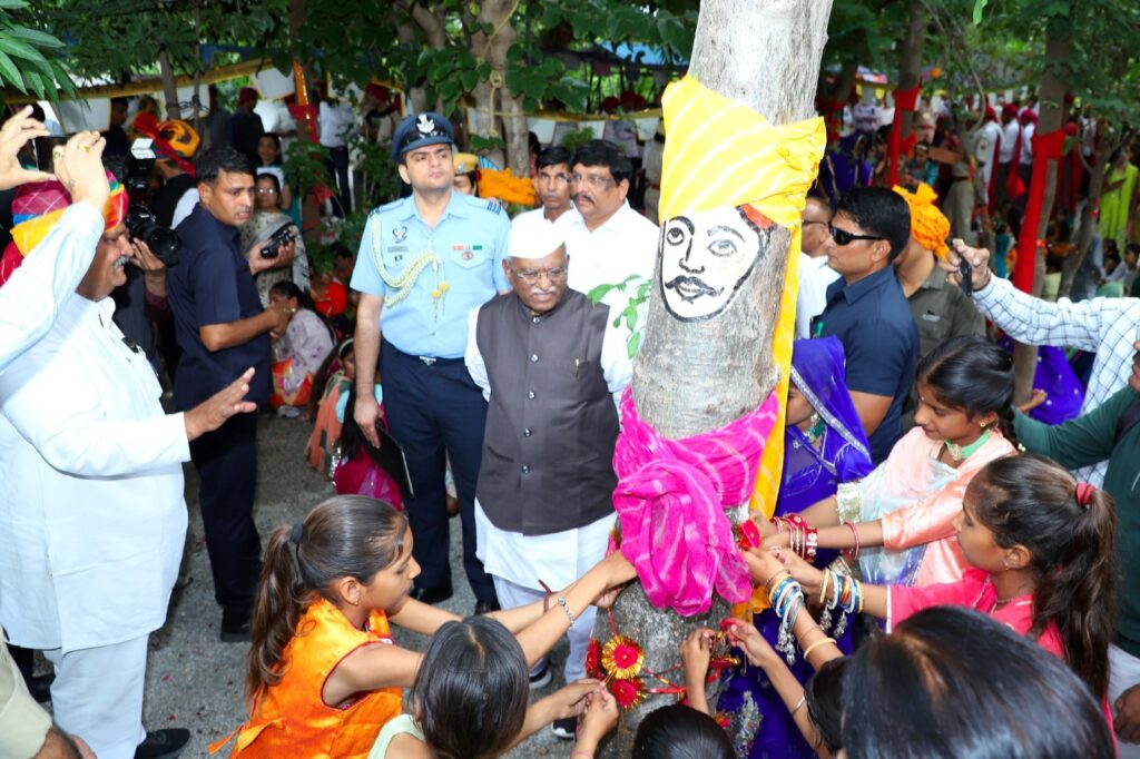 अनोखी परंपरा और पर्यावरण के प्रति प्रेम के लिए देश दुनिया में मशहूर पिपलांत्री गांव में इस बार राज्यपाल हरिभाऊ बागड़े के सानिध्य में रक्षाबंधन का पर्व मनाया। रक्षाबंधन का पर्व भाई-बहन के पवित्र रिश्ते का प्रतीक है, इस गांव में एक अलग ही अंदाज में मनाने की परम्परा जुड़ गई। इसके तहत यहां की बेटियां अपने भाइयों की कलाई से पहले पेड़ों को राखी बांध कर उनके संरक्षण व संवर्द्धन का संकल्प लेती है। इस तरह यहां की महिलाएं व युवतियां पेड़ को भाई मानती है। यह परंपरा न केवल पर्यावरण संरक्षण की मिसाल है, बल्कि बेटियों के सम्मान और प्रकृति के प्रति गहरे लगाव का प्रतीक भी है।