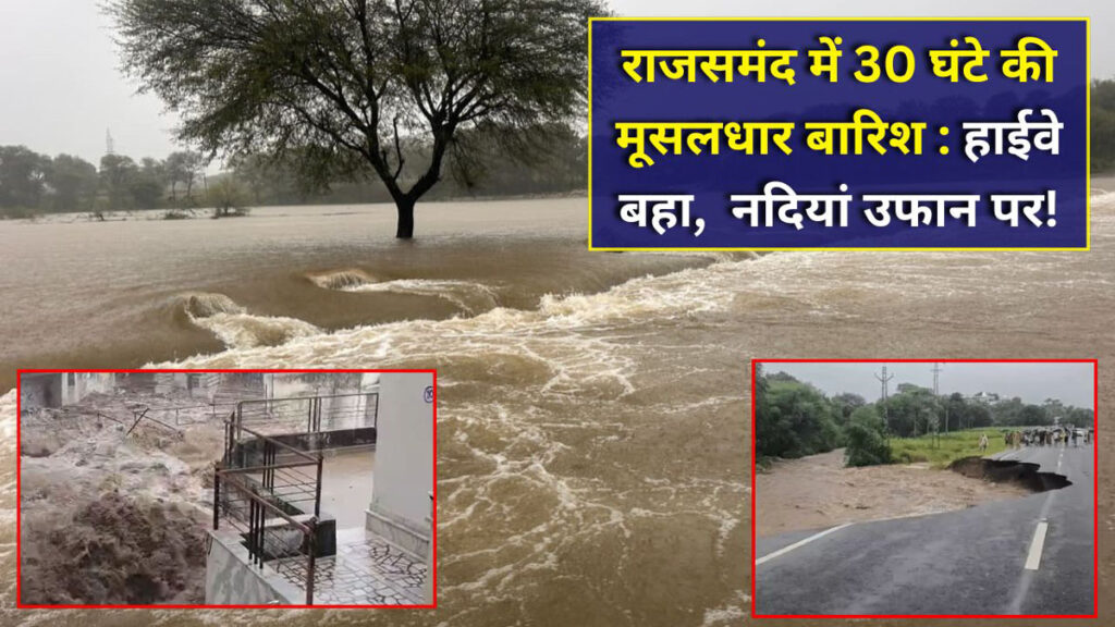 Rajsamand Heavy Rainfall : राजसमंद शहर के साथ जिलेभर में शुक्रवार रात से झमाझम बारिश का दौर शनिवार दोपहर तक भी जारी है। तेज बारिश के चलते कुंभलगढ़ में रिछेड़ के पास हाइवे बह गया और सुबह से आवागमन ठप है, जबकि केलवाड़ा का पटवार भवन ढह गया, जबकि गोमती नदी, बनास नदी के साथ चन्द्रभागा नदिया अचानक उफान पर आ गई। इस कारण एक दर्जन रास्ते अवरुद्ध हो गए है। लगातार बारिश से पूरा जनजीवन प्रभावित है। पिछले 30 घंटों में सबसे ज्यादा बारिश गढ़बोर तहसील में 6 इंच से ज्यादा यानि 160 एमएम बारिश हुई है। तबाही की बारिश के बीच कलक्टर अरुण कुमार हसीजा ने सभी स्कूलों की छुट्टी कर दी। हालांकि कई छात्र स्कूल पहुंच चुके थे, जो भीगते हुए वापस लौटे। राजसमंद झील का गेज 24 फीट के करीब पहुंच गया, जबकि बाघेरी बांध पर शनिवार सुबह 10 इंच चादर थी, जो दोपहर बाद बढ़कर 2 फीट हो गई। नन्दसमंद के 4 गेट खोलने पड़े और मतृकुंडिया डेम के भी सुबह 11 बजे 3 गेट खोल दिए। लगातार पानी की आवक बढ़ रही और जिला कलक्टर ने आमजन को घर में ही रहने और जलबहाव क्षेत्र में नहीं जाने का अलर्ट जारी दिया और सभी नदी व बांध पर पुलिस तैनात कर दी है।
