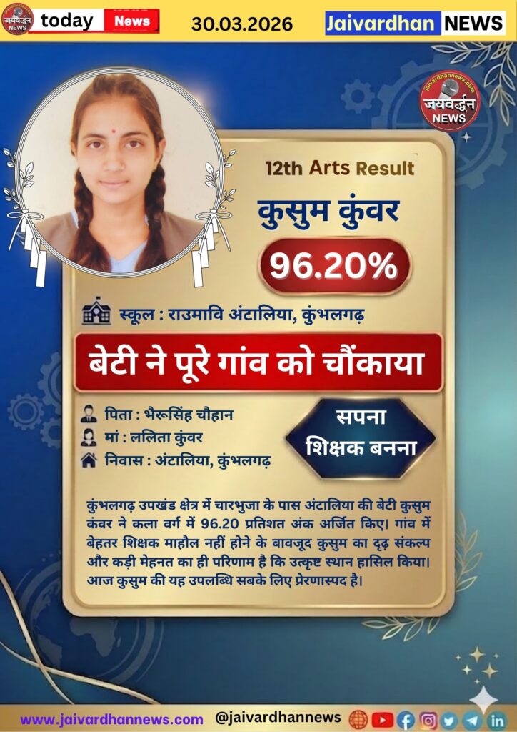 RBSE 12th Science Result : राजसमंद में पिपलांत्री पंचायत के भुडान में लौहारो की भागल निवासी जिनल कुंवर ने 96.2 प्रतिशत अंक बनाए। उनके पिता अभयसिंह व्यवसायी है, जबकि मां गृहिणी है। वह पुठोल के राउमावि में पढ़ती थी और स्कूल में दूसरा स्थान बनाया। वह परीक्षा के दौरान सुबह 3 बजे उठकर पढ़ने लग जाती थी। स्कूल में मॉडल पेपर के माध्यम से शिक्षकों ने खूब मोटिवेट किया। उसकी मां पारस कुंवर गृहिणी है। उपलब्धि का श्रेय खुद को, माता- पिता व शिक्षक को देती है।
