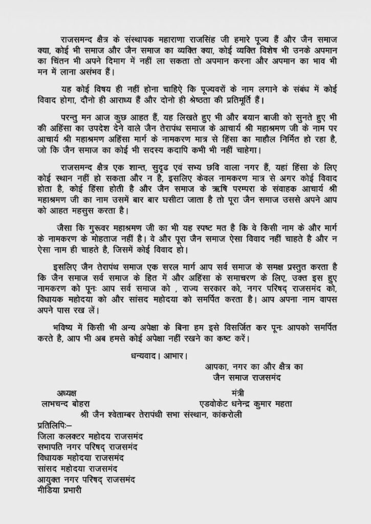 राजसमंद शहर में विवादित सड़क का का नाम “आचार्य महाश्रमण अहिंसा मार्ग” हटाने के लिए सरेंडर पत्र जैन समाज द्वारा जिला कलक्टर अरुण कुमार हसीजा को सौंपा। साथ ही सरेंड पत्र की प्रतिलिपि नगरपरिषद राजसमंद के सभापति, नगरपरिषद आयुक्त, राजसमंद विधायक दीप्ति माहेश्वरी, राजसमंद सांसद महिमा कुमारी मेवाड़ के अलावा मीडियाकर्मियों को भी प्रतिपिलिप दी गई है।