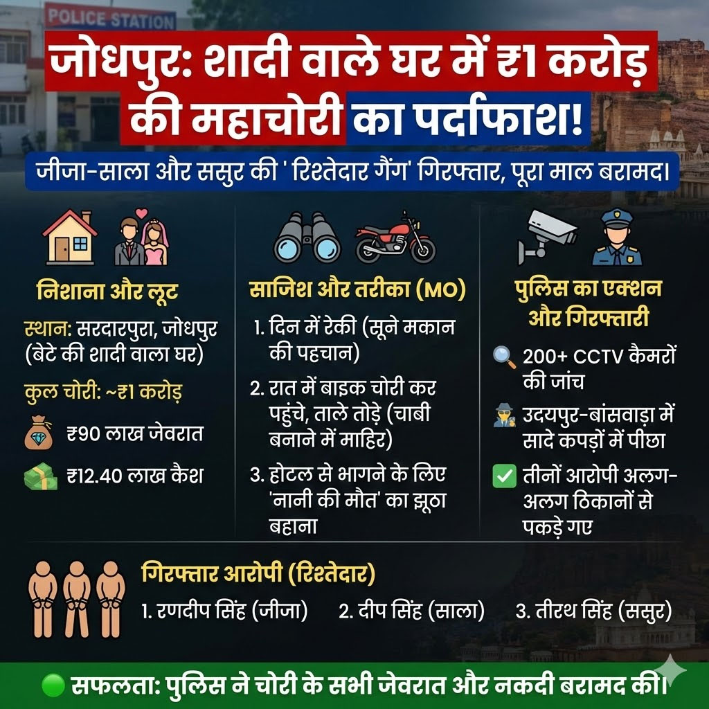 Rajasthan police Alert : सरदारपुरा की यह वारदात केवल एक बड़ी चोरी का मामला नहीं है, बल्कि यह दिखाती है कि अपराधी कितनी प्लानिंग के साथ काम करते हैं। दिनभर रेकी, रात में बाइक चोरी, फिर उसी बाइक से चोरी और बाद में बहाना बनाकर फरार। लेकिन पुलिस की सतर्कता, सीसीटीवी विश्लेषण और मुखबिर तंत्र की मदद से जीजा–साला और ससुर की यह साजिश ज्यादा दिन नहीं चल सकी। शादी की खुशियों के बीच आई इस बड़ी वारदात ने इलाके में दहशत जरूर फैलाई, लेकिन पुलिस की तत्परता ने यह भरोसा भी दिलाया कि अपराधी कितनी भी चालाकी कर लें, कानून के हाथ लंबे होते हैं।