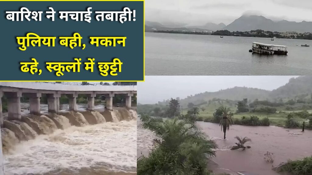 Udaipur heavy rainfall : राजस्थान के उदयपुर जिले में पिछले 24 घंटों से लगातार हो रही मूसलाधार बारिश ने जनजीवन को पूरी तरह अस्त-व्यस्त कर दिया है। भारी बारिश के कारण नदी-नाले उफान पर हैं, कई गांवों का संपर्क टूट गया है, और सड़कें-पुलिया बह गई हैं। घरों और दुकानों में पानी घुस गया है, मवेशी बह गए हैं, और कई जगह मकान ढहने की घटनाएं सामने आई हैं। मौसम विभाग ने उदयपुर के लिए ऑरेंज अलर्ट जारी किया है, जिसके चलते जिला प्रशासन ने स्कूलों और आंगनबाड़ी केंद्रों में छुट्टी घोषित कर दी है। इस लेख में हम उदयपुर में बारिश से उत्पन्न स्थिति, प्रभावित क्षेत्रों, और राहत कार्यों का विस्तृत ब्योरा प्रस्तुत कर रहे हैं।