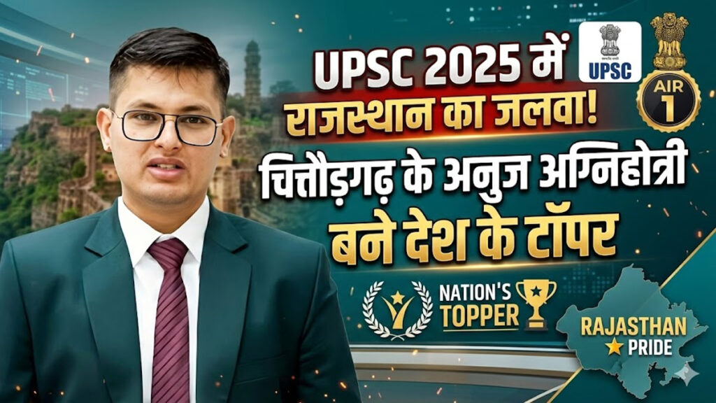 UPSC TOPPER 2025 ANUJ AGNIHOTRI : में AIR-1 हासिल करने वाले अनुज अग्निहोत्री राजस्थान के चित्तौड़गढ़ जिले के रावतभाटा कस्बे के निवासी हैं। उनकी इस ऐतिहासिक सफलता से पूरे प्रदेश में खुशी का माहौल है।