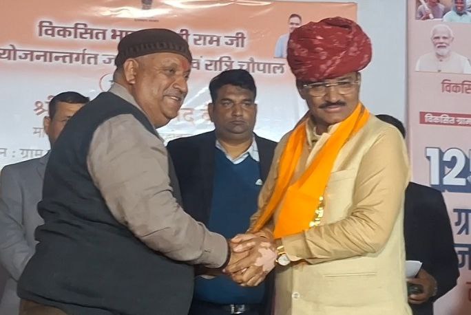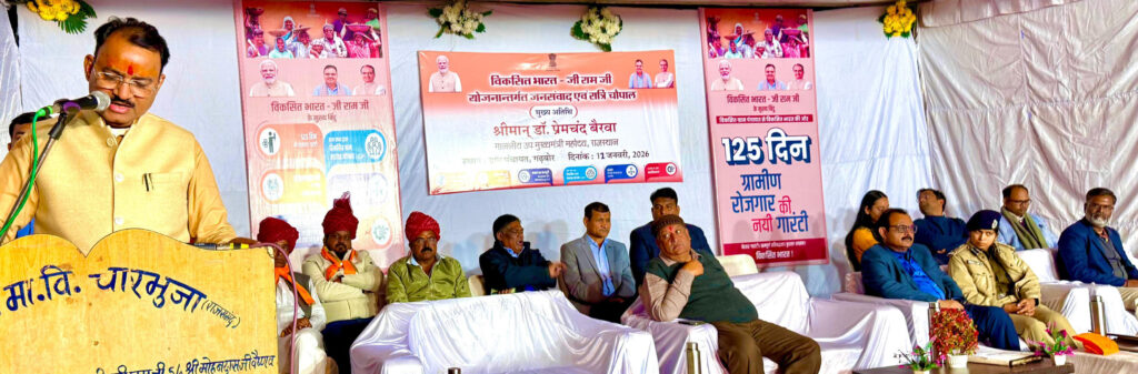 VB G ram G Update : राजसमंद। उप मुख्यमंत्री एवं जिला प्रभारी मंत्री डॉ. प्रेमचंद बैरवा ने सोमवार शाम कुंभलगढ़ उपखंड के ग्राम चारभुजा–गढ़बोर में आयोजित रात्रि चौपाल को संबोधित करते हुए विकसित भारत–रोज़गार एवं आजीविका गारंटी मिशन (ग्रामीण) अधिनियम 2025, जिसे संक्षेप में वी.बी.जी. राम जी कहा जा रहा है, के नवीन प्रावधानों की विस्तार से जानकारी दी। उन्होंने कहा कि देश आज प्रधानमंत्री नरेन्द्र मोदी के नेतृत्व में हर क्षेत्र में तेज़ी से प्रगति कर रहा है और आज का भारत नया भारत बन चुका है। इस दौरान कुंभलगढ़ विधायक एवं पूर्व मंत्री सुरेन्द्र सिंह राठौड़, जिला कलक्टर अरुण कुमार हसीजा (IAS Arun Kumar Hasija), एडीएम नरेश बुनकर, जिला परिषद सीईओ बृजमोहन बैरवा, कुंभलगढ़ एसडीएम साक्षी पूरी आदि मंच पर मौजूद रहे।